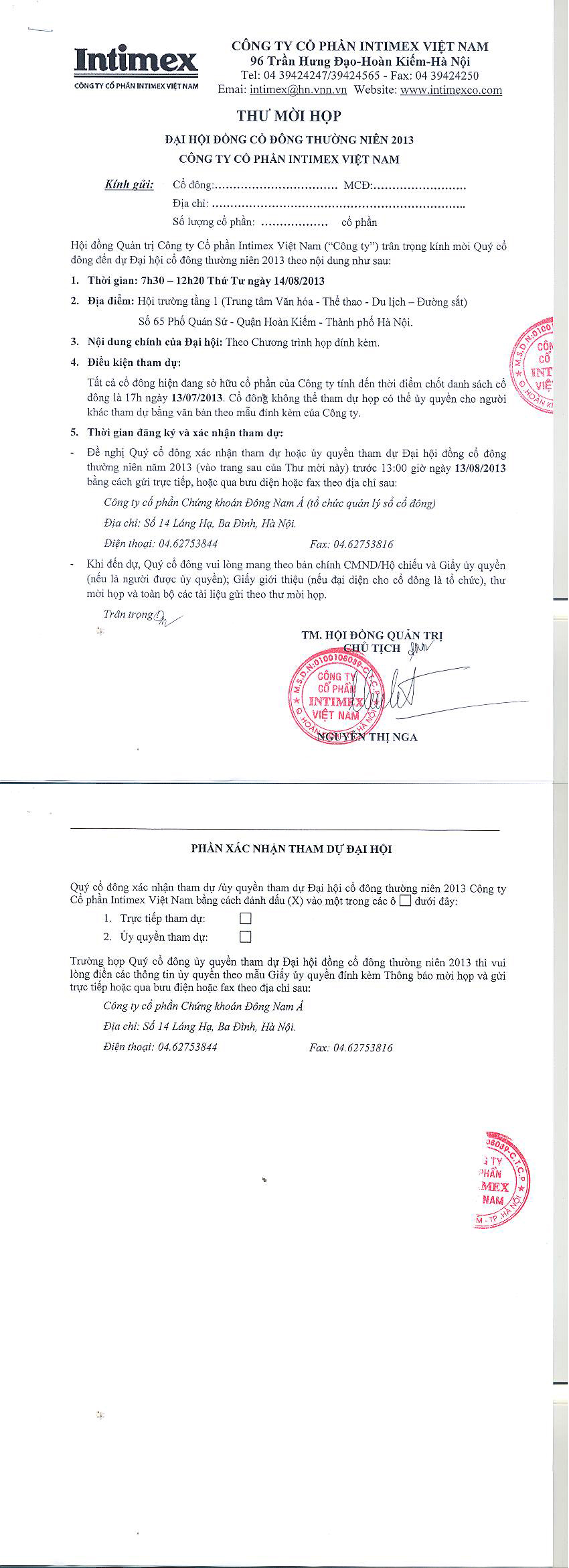 Thông báo mời họp Đại Hội Đồng Cổ Đông Công Ty Cổ Phần Intimex Việt Nam năm 2013